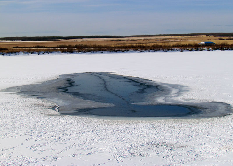The title of this article is a bit misleading in that it would seem to be dealing specifically with safety issues related to open water ice fishing. Not so. There may be food forthought here for anyone who lives in close proximity to any kind of open water in winter. Dugouts, storm water storage ponds, open rivers, aerated lakes, sewage lagoons are all examples of waterbodies that may be open or have thin ice. They don’t have to be aerated either as there are a number of ways that heat can either be created or transferred that can make ice potentially unsafe. We don’t have to go into the reason why you, a normally rational person, might be out on potentially thin ice. They all usually revolve around necessity, recreation or compassion and suffice to say that they all seem like a good idea at the time.