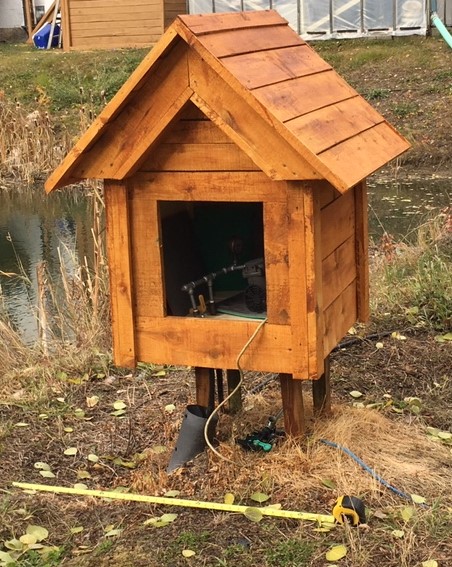 My son Colin drowned out his first compressor and for not much of a commitment in time and cash created the following solution to a large fluctuation in the waterline in his pond. the screen just about eliminates the need for servicing the compressor’s intake filter although an old sock over the filter is still not a bad idea. In winter he can afford the compressor some additional protection from the elements by adding 3 wooden sides held in place with deck screws on the 3 most windward sides.